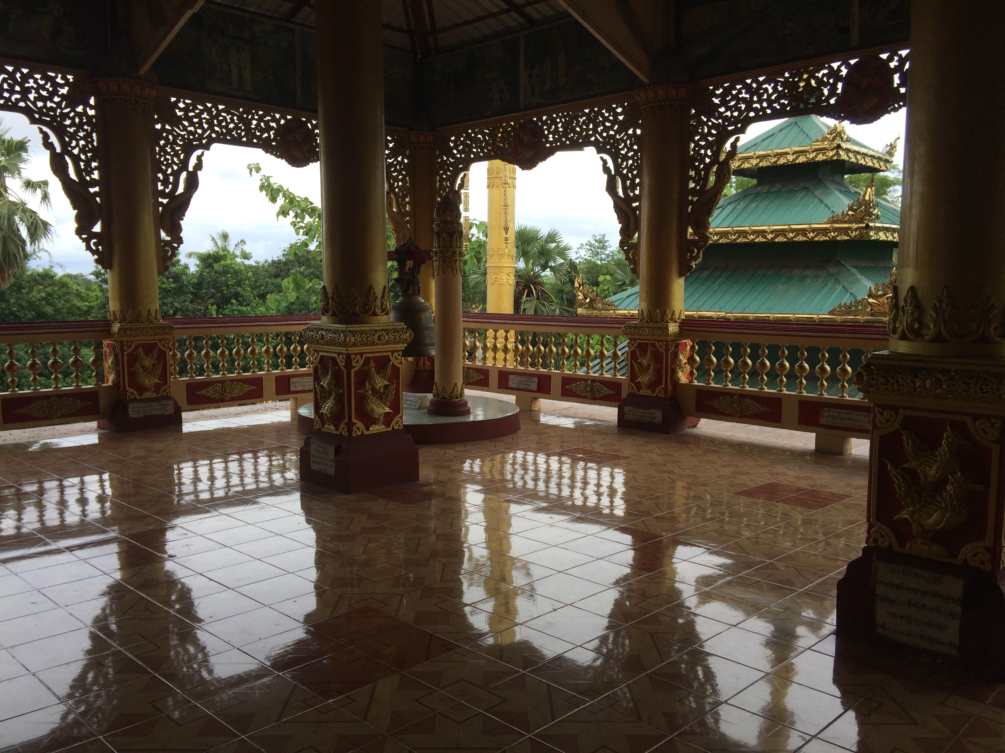Doch hier in Bago sind die Pagodas anders. Sie sind nicht touristisiert, noch nicht erschlossen, noch nicht verändert und umbaut, um vielen Menschen einen tollen Ausblick zu gewähren. Hier gibt es keine Spiritualität, keine Mönche, keine Laufrichtung, die nicht durchbrochen werden darf. Eine ganz andere Ruhe und Einfachheit liegt hier. Ein durchweg goldene Stupa mag zwar nicht auf Anhieb einfach erscheinen, doch sie ist einfach gehalten, simpel, letztlich einfarbig. Gold geht in Gold über und formt sich zu Spitzen, Rillen, Vorständen und Rundungen. So ist es wirklich ein Erlebnis, barfuß auf den Fliesen zu schlurfen, in jedem neuen Blickwinkel die Pagoda abzulichten und sie doch schwerlich als Ganzes auf die Linse zu kriegen. Von der Spitze ertönt Glockengeläut von unzähligen kleinen Glöckchen und der Gewitterhimmel tut sein Restliches zur besonderen Stimmung.