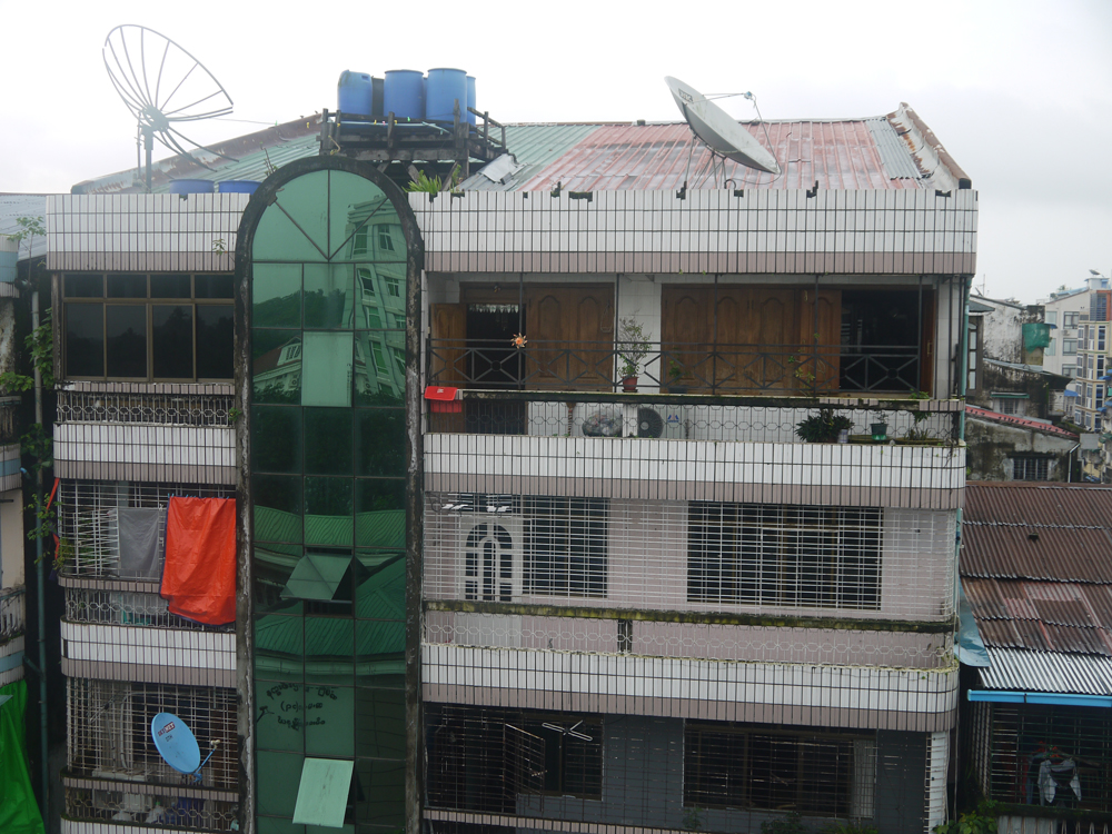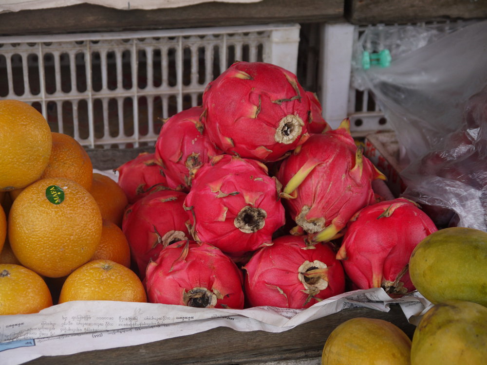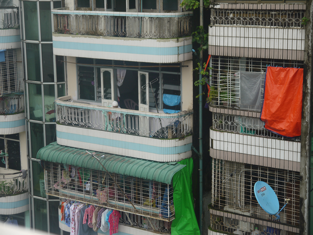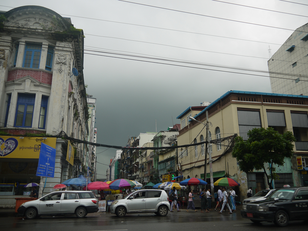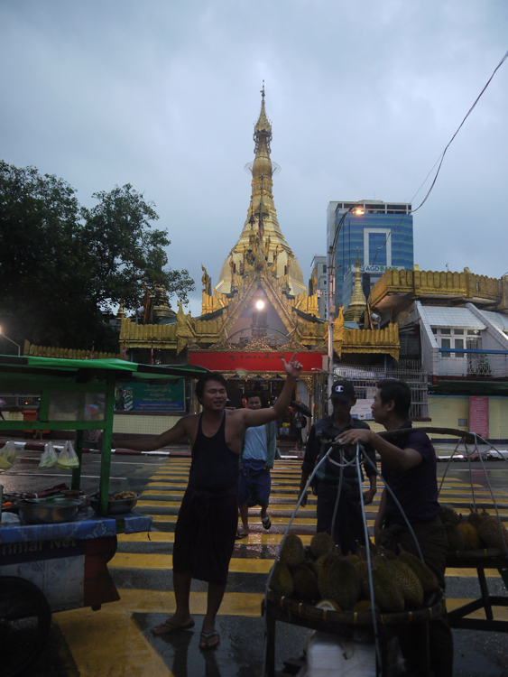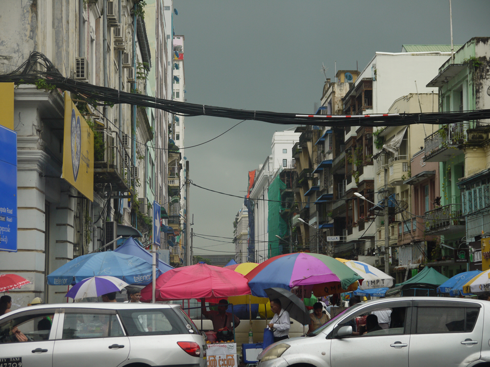 In Downtown zu leben – und sei es nur für eine kurze Zeit – ist eine schräge Erfahrung. Ich bekomme den Eindruck, dass wir so viel näher am Geschehen sind als wir es in unserer neuen Wohnung (seit zwei Monaten) in der Ma Po Street in Sanchaung sind. Direkt gegenüber von der Wohnung im achten Stockwerk finden wir viele kleine Kioske und einen Markt, auf dem Gemüse und Obst und schräges Obst und schräges Gemüse angepriesen werden. Direkt um die Ecke befindet sich ein indisches Restaurant, in dem Fast Food-ähnlich Thalis (große Teller mit verschiedenen Currys und Teigfladen: Puris, Chapatis, Parathas) oder verschiedene Currys (südindisches Cashew-Curry oder Kartoffel-Blumenkohl-Curry) zur Auswahl stehen. Zugegebenermaßen ist es nicht die feine indische Küche der Mittelklasse, doch lecker, schnell und günstig allemal.