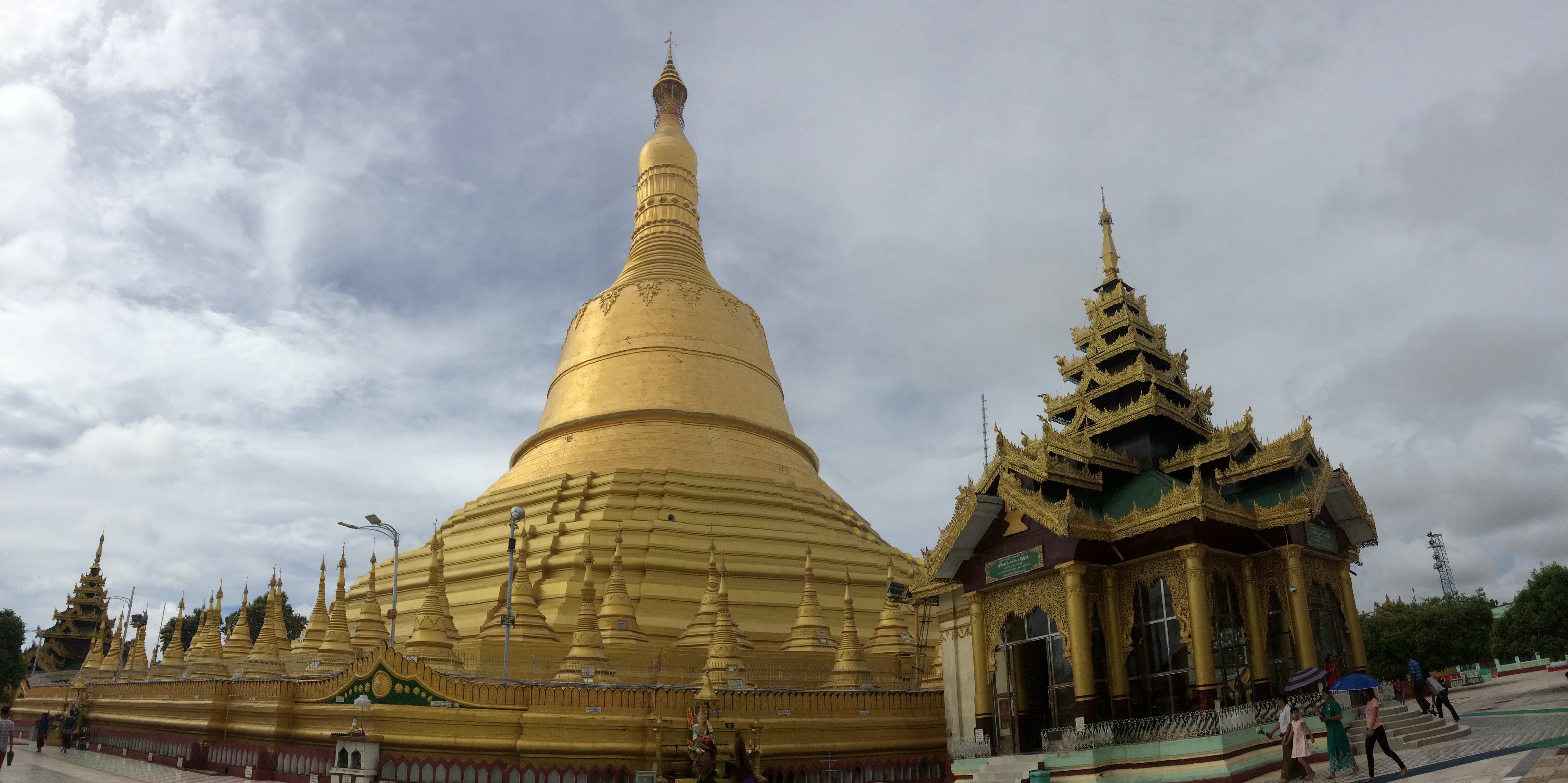 Zurück auf der friedlichen Straße machen wir uns auf den Weg zum nächsten Tempel, der großen Pagoda Shwedawmaya. Sie ist sogar größer als das Wahrzeichen Yangons und kann durchaus mit ihrer Leuchtkraft und Imposanz mithalten. Nachdem einige Reisebusse uns beim alten Königspalast begleitet haben sind wir hier nun die einzigen Touristen. Es ist insgesamt nicht viel los und es ist ein wirklich traumhaftes Gefühl, den Platz entspannt erkunden zu können. Wir flanieren um die große, goldene Glockenform herum und ich gerade wirklich ins Staunen. Es ist ein ganz anderes Gefühl als bei der Bouddhanath Pagoda in Nepal. Dort war ein geschäftiges Treiben und unzählige Händler priesen ihre Ware an. Tibetische Gebetsfahnen, Thanaka-Gemälde in jeder Größe und Farbe, Masken, Steine, Schmuck, Gemälde. Das Erlebnis kam, wenn man sich auf Augenhöhe mit der Stupa begeben hat. Dann saßen wir auf der Dachterrasse des kleinen Restaurants und genossen einfach den Ausblick. Dort konnte ich für Stunden und Stunden sitzen, staunen und völlig glücklich das Treiben beobachten. Teil davon war ich nicht, aber das vermisste ich in dem Moment auch gar nicht.