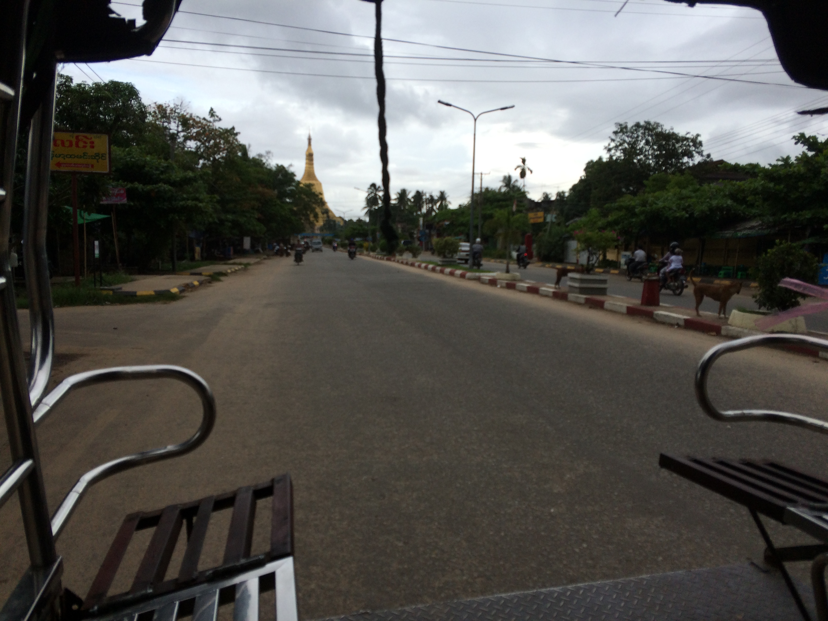Es ist anstrengend, dem Lärm ausgesetzt zu sein und ich merke schnell den großen Unterschied zu Yangon. Dort sind Motorräder verboten, nur Autos, Fahrräder und Rikschas (hier Trikshaws genannt) sind auf den Straßen erlaubt. Die Autos sind neu, modern und mit Filtersystemen ausgestattet, die die Motorräder nicht immer bieten können. Zudem sind wir von der vierstündigen Anreise müde und hatten noch keinen ersten Kaffee des Tages. Alles keine begünstigenden Faktoren. Doch als wir ein Fresh Thai Restaurant auf dem Dach einer Shopping Mall finden, komme ich auch langsam wieder zu Kräften. Mit Keksen und Saft ausgestattet lässt sich das Chaos der Hauptstraße schon viel besser ertragen und als ich die erste Pagoda erblicke, kann der Tag beginnen.