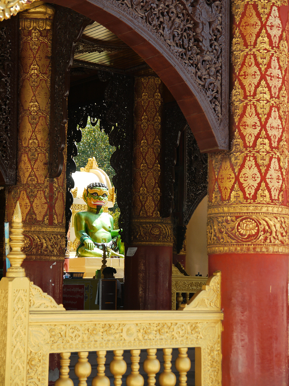 Als ich um 8 die Wohnung verlasse kommt die Hitze hervor. Im Schatten ist es noch angenehm kühl, doch lange lässt es sich in der prallen Sonne auch zu dieser Zeit schon nicht aushalten. So verzichte ich auf meinen geplanten 3,5 km Weg zur goldenen Shwedagon Pagoda und hole mich doch schnell ein Taxi. „Beh lau leh?“ frage ich den Taxifahrer und einige mich mit ihm nach wenig Verhandeln auf 1.500 Kyat (MMK). Da der momentane Wechselkurs irgendwo bei 1.600 MMK zu 1€ steht ist das ein durchaus akzeptables Angebot. Ich sage „Ya ba deh“ – alright und „Tsche su ba!“ – Danke! Die Adresse hat er zwar noch nicht ganz verstanden, sodass wir uns letztlich in einer schmalen Gasse zwischen einem Wasserlieferant und einer Fahrradrikscha durchmogeln, doch schließlich kommen wir doch am vereinbarten Ziel an. Auch wenn er zwischendurch noch einmal kurz versucht, doch noch auf 2.000 Kyat hochzugehen bleiben wir bei dem vereinbarten Betrag, der für die Strecke auch durchaus angemessen ist.