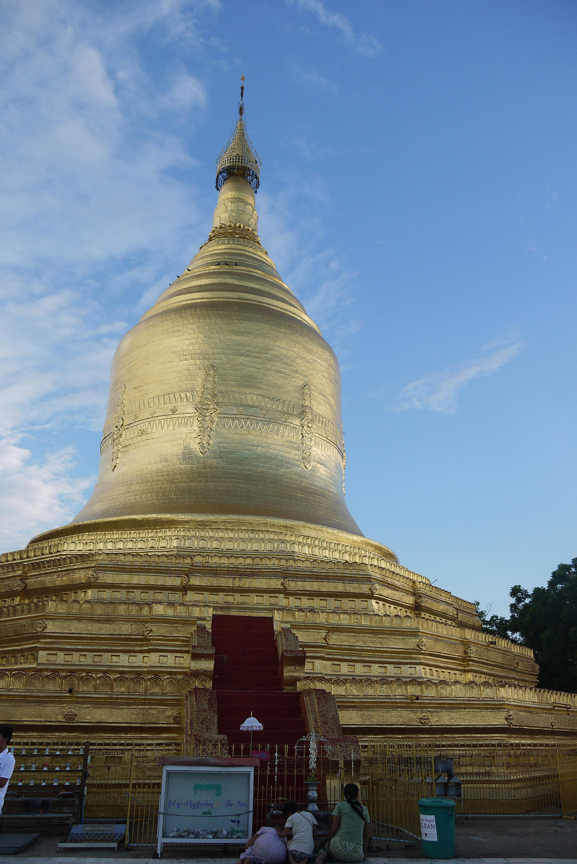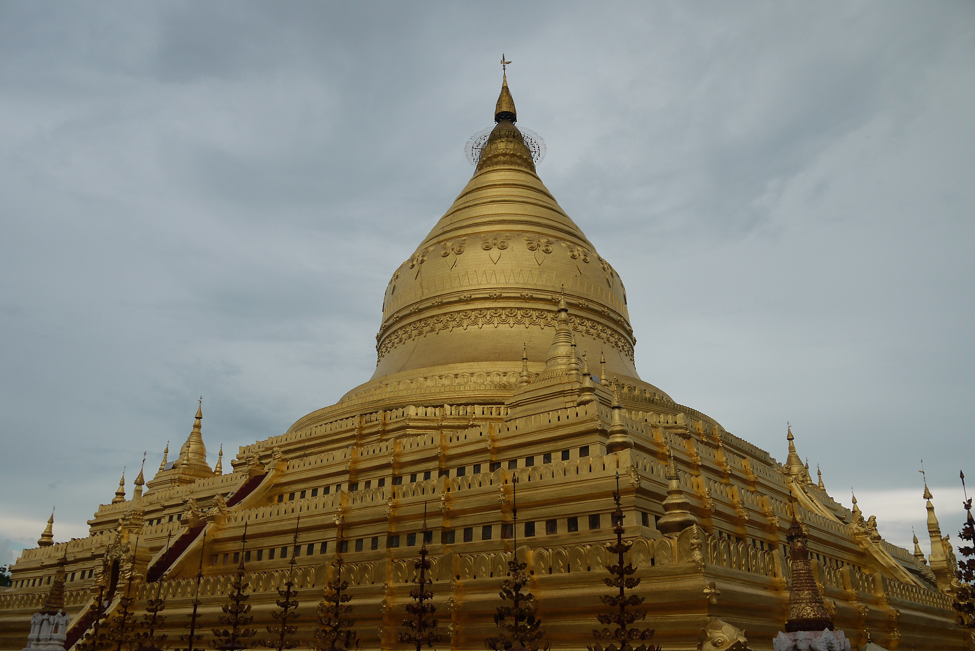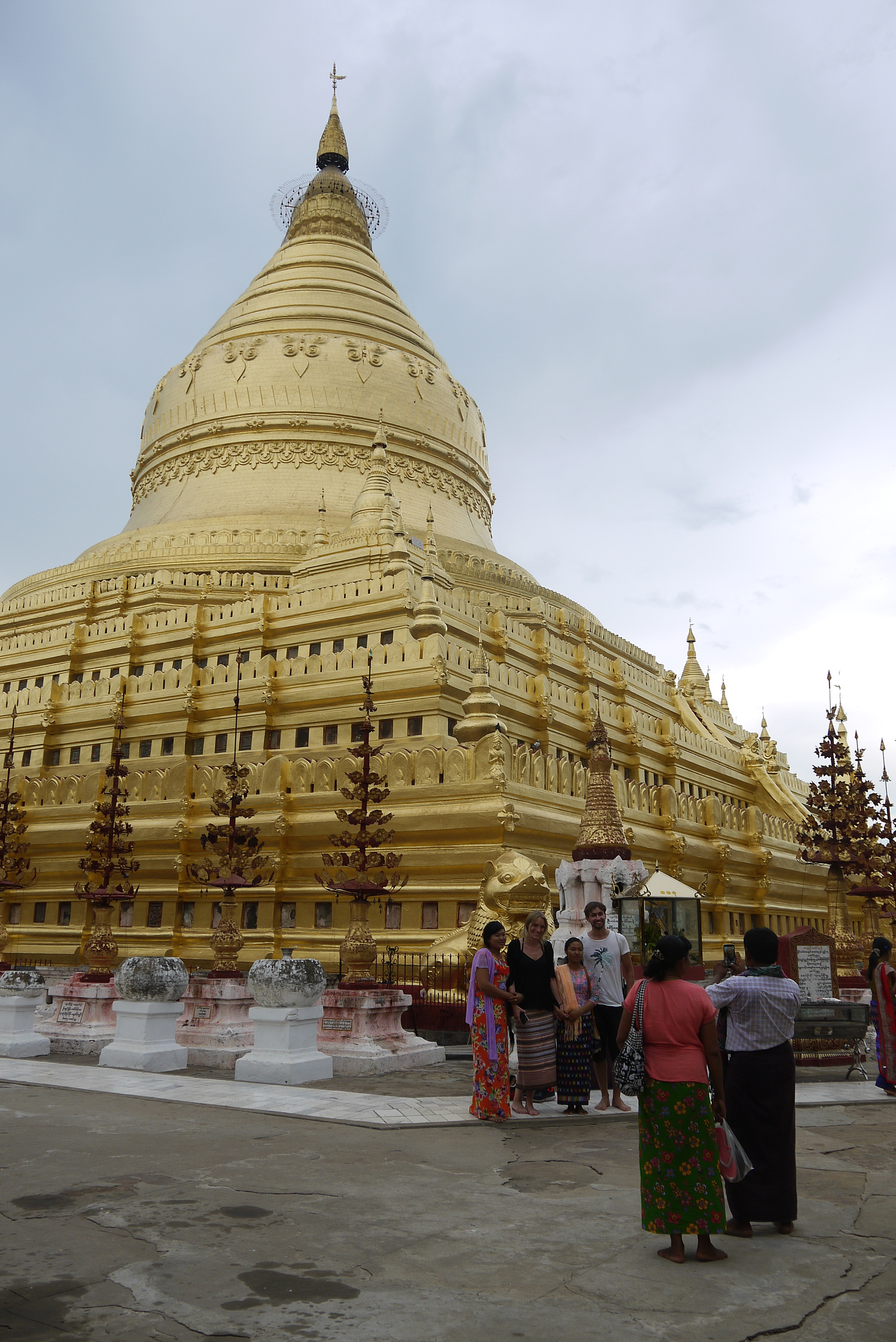 In Nyaung-U erkunde ich zuerst die Shwezigon Pagode, die eines der Wahrzeichen Bagans ist. Wie fast alle Pagoden in Myanmar ist sie gold, strahlend gold. Es sind schon unglaubliche Bauwerke, die sich gegenseitig im Prunk zu übertrumpfen versuchen. Yangons ShweDAgon Pagode ist ja auch ein Prachtstück, das sich von überall her sehen lässt. Doch auch hier kann ich viele Touristen verstehen, die sich doch früher oder später sattsehen. Verständlich allein durch die schiere Masse der goldenen Glanzlichter. Verständlich aber auch durch die überwiegende Ähnlichkeit, die einem Laien nicht viel Unterscheidung ermöglicht.