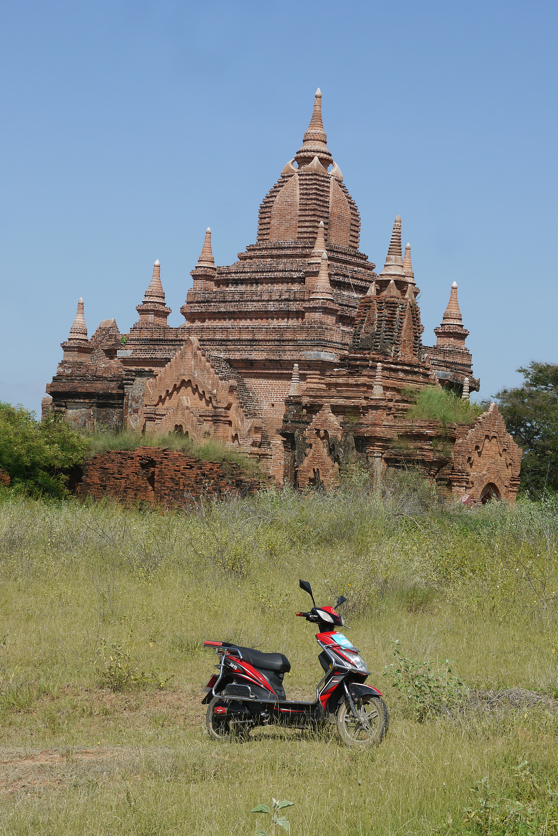 Bagan lässt sich ideal mit dem E-Scooter erkunden, die es für 5,000 Kyat (2,70€) pro Tag zu mieten gibt. Lächerlich wenig für die Strecke, die wir damit an einem Tag zurücklegen können. Zwar spinnt immer wieder mal das Tacho, das Licht funktioniert nicht (besonders abends bei unbeleuchteten Straßen ideal) und die Batterie kann auch mal um 11 Uhr morgens schon alle gehen. Doch meist braucht man nur anzurufen und wird gerettet; denn weit ist es ja eh nirgendwo hin.