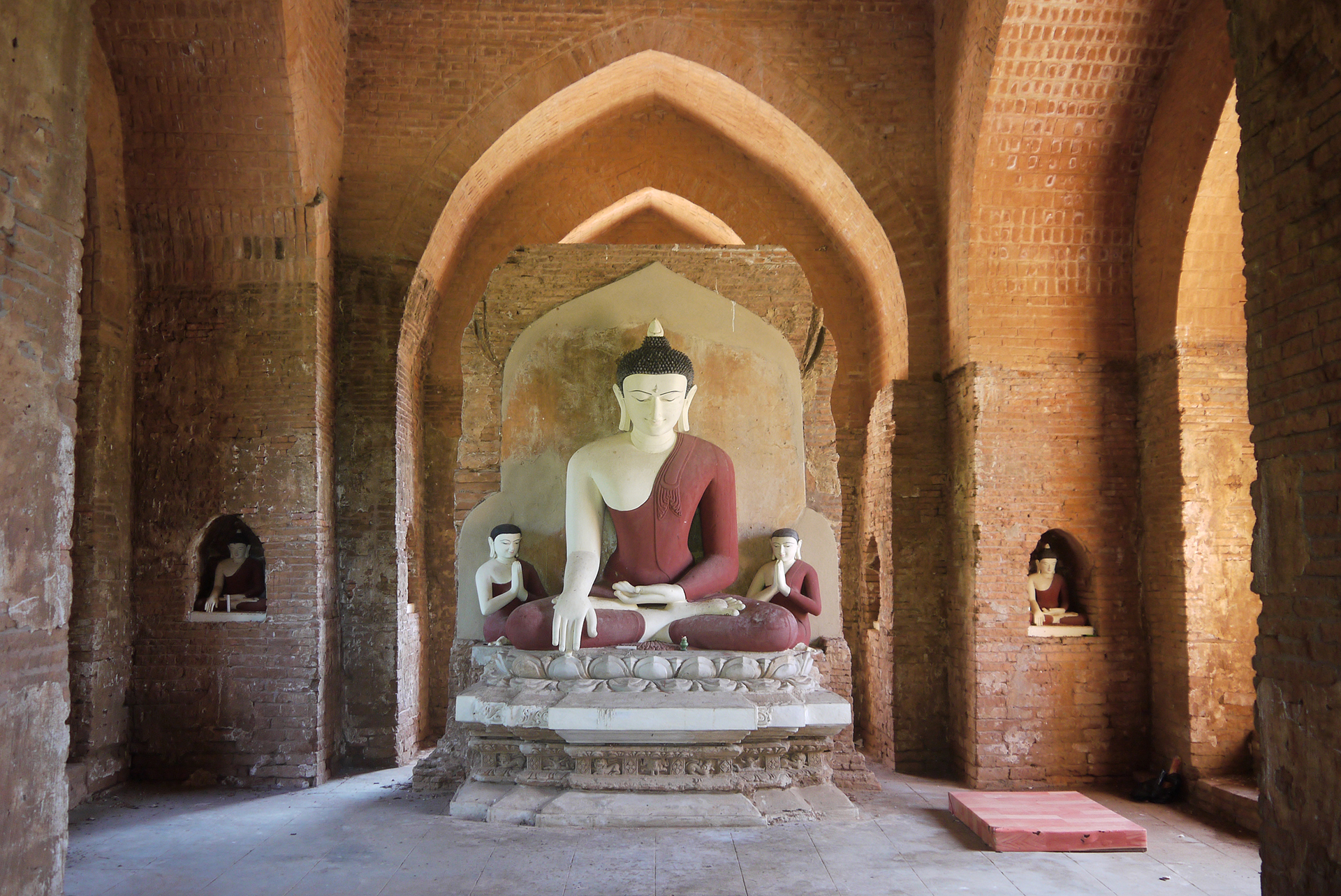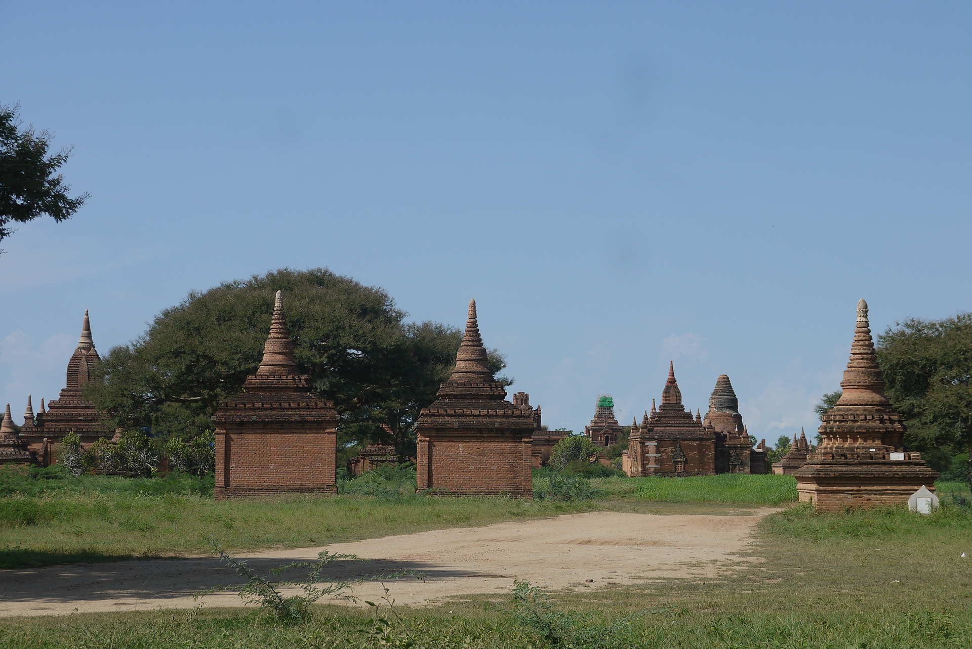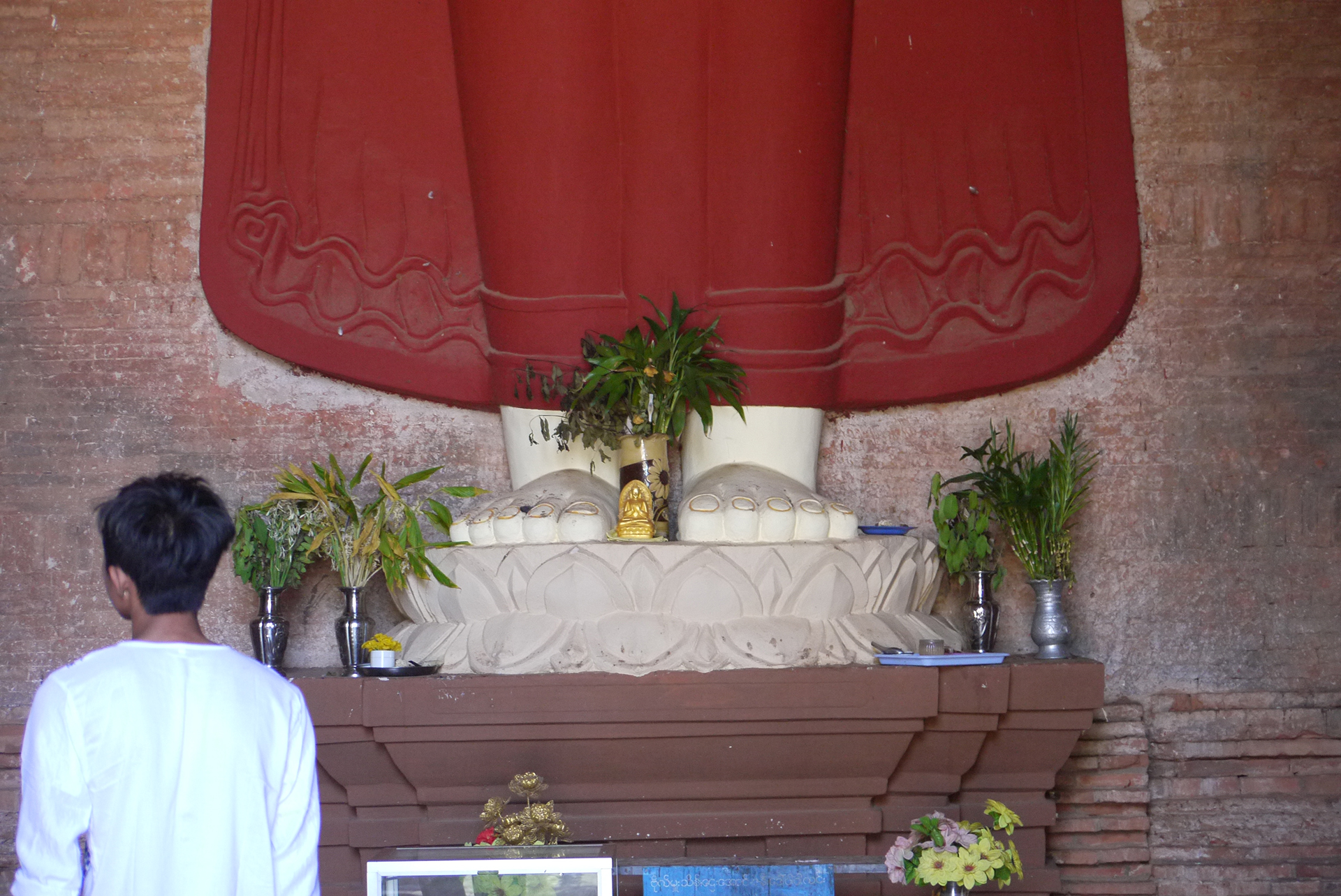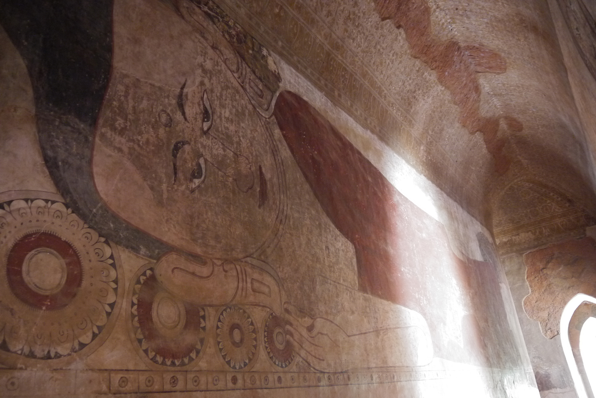 Einigen wird hier schnell langweilig, da sich die Tempel in ihren Hauptmerkmal doch ähneln. Fast alle sind rostrot und aus Backsteinen gebaut. Früher waren sie wohl alle mal mit Stuck übersät und vermutlich angemalt. Heute sind nur noch bei den Wenigsten die Oberflächen erhalten. Doch auch so konnte ich mich kaum sattsehen und war immer wieder fasziniert, wenn eine weitere Ansammlung von Tempeln vor mir auftauchte, die nicht einmal annähernd im Reiseführer aufgeführt werden. So passiert es immer wieder, dass sich plötzlich ein Tempelkomplex vor uns erhebt, der unglaublich groß und gut erhalten ist. Wir finden den Namen kaum im Reiseführer, doch staunen über die detaillierten und extrem weitläufigen Wandmalereien, die einen bestimmt zehn Meter langen liegenden Buddha zeigen. Auch die Buddha-Statuen, die von vielen myanmarischen Besuchern verehrt werden, reichen bis unter die Decke und machen Eindruck.