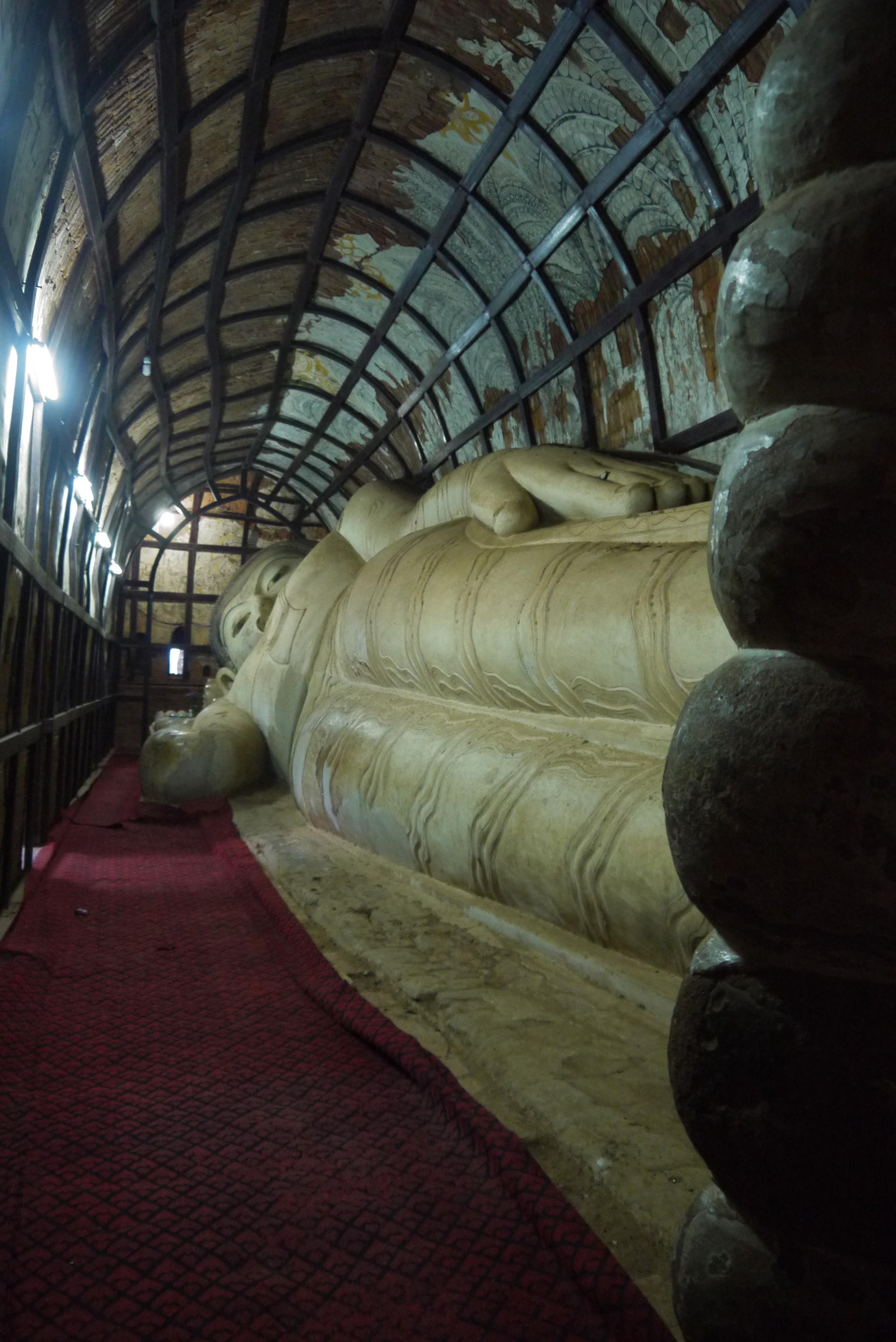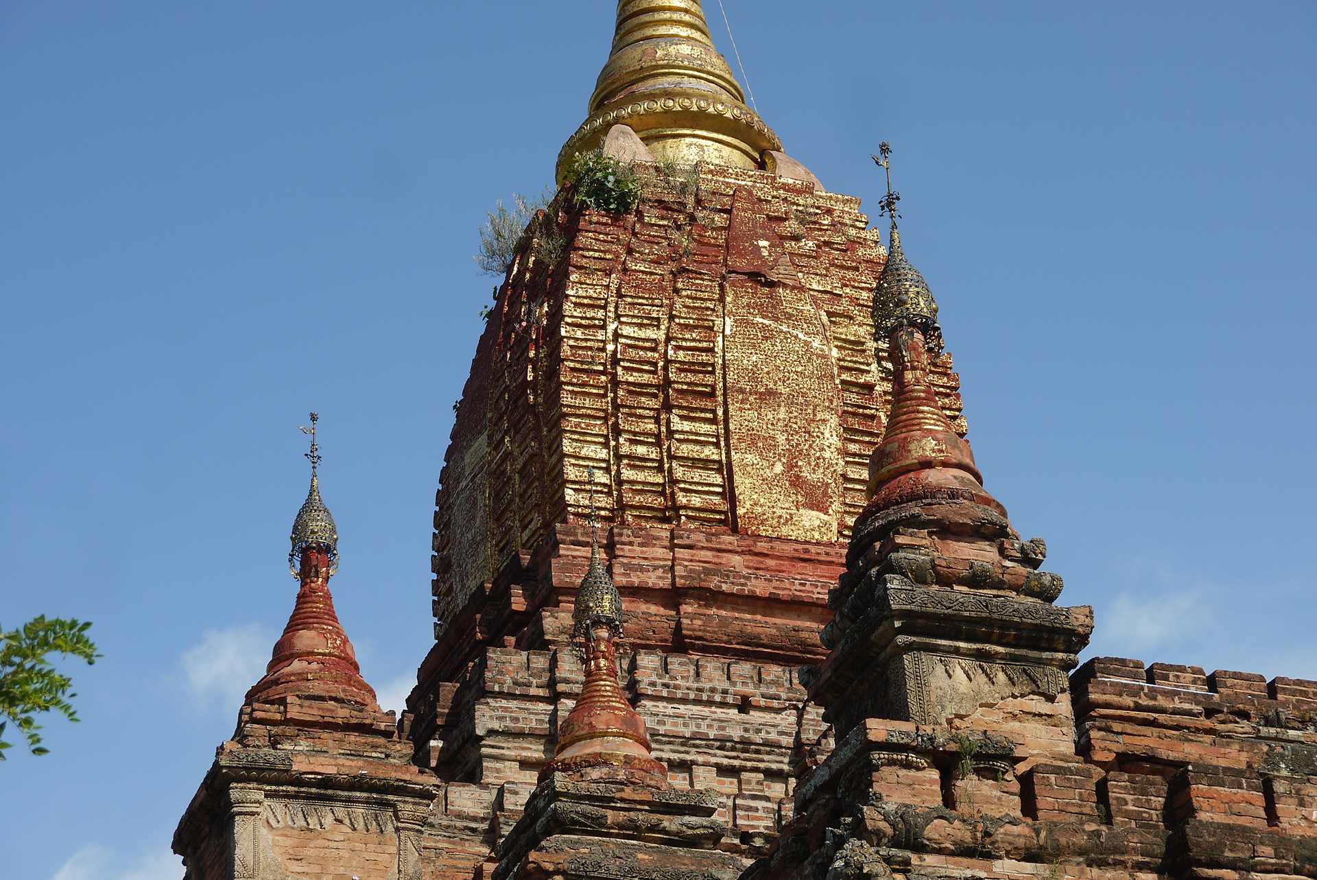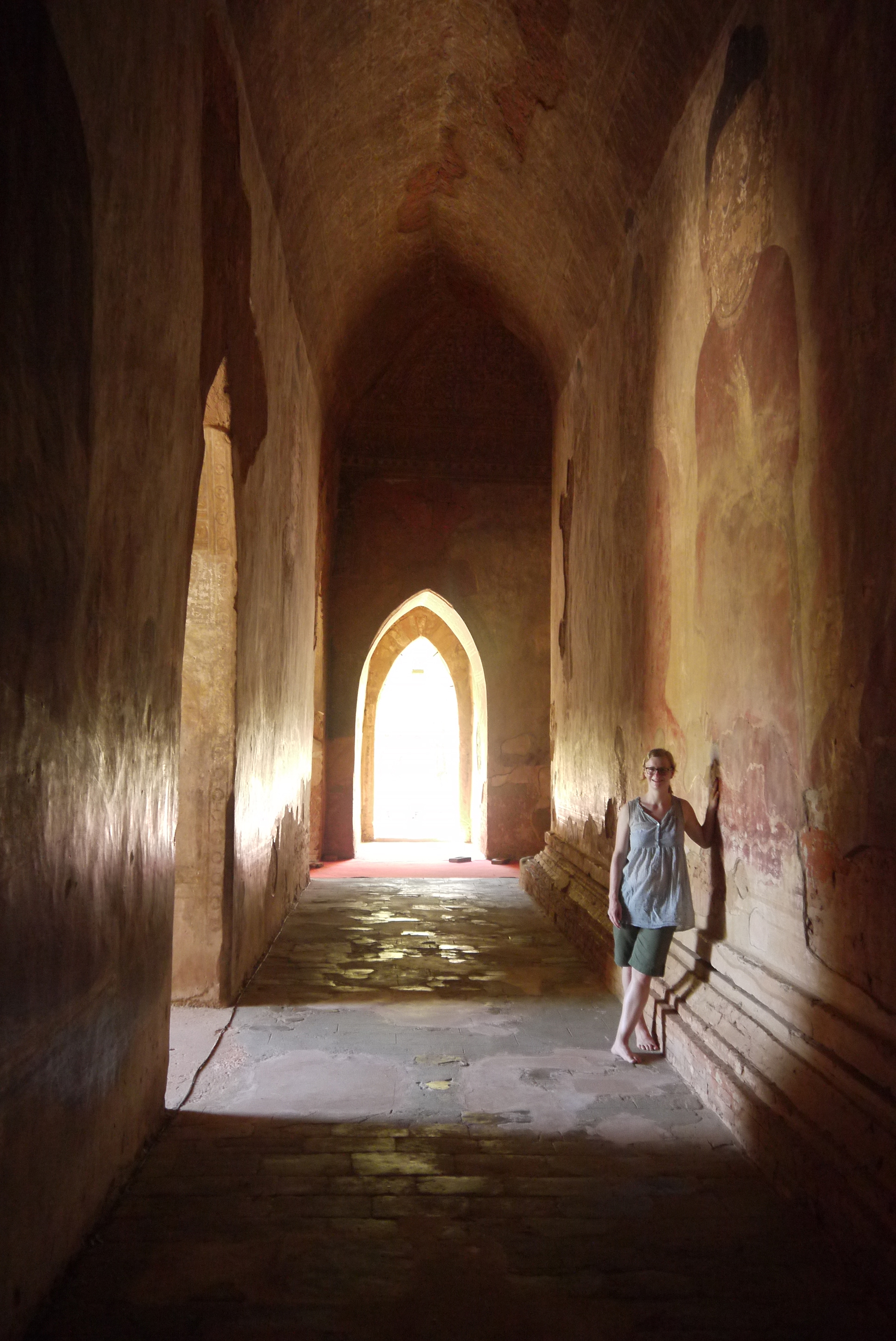 Einigen wird hier schnell langweilig, da sich die Tempel in ihren Hauptmerkmal doch ähneln. Fast alle sind rostrot und aus Backsteinen gebaut. Früher waren sie wohl alle mal mit Stuck übersät und vermutlich angemalt. Heute sind nur noch bei den Wenigsten die Oberflächen erhalten. Doch auch so konnte ich mich kaum sattsehen und war immer wieder fasziniert, wenn eine weitere Ansammlung von Tempeln vor mir auftauchte, die nicht einmal annähernd im Reiseführer aufgeführt werden. So passiert es immer wieder, dass sich plötzlich ein Tempelkomplex vor uns erhebt, der unglaublich groß und gut erhalten ist. Wir finden den Namen kaum im Reiseführer, doch staunen über die detaillierten und extrem weitläufigen Wandmalereien, die einen bestimmt zehn Meter langen liegenden Buddha zeigen. Auch die Buddha-Statuen, die von vielen myanmarischen Besuchern verehrt werden, reichen bis unter die Decke und machen Eindruck.