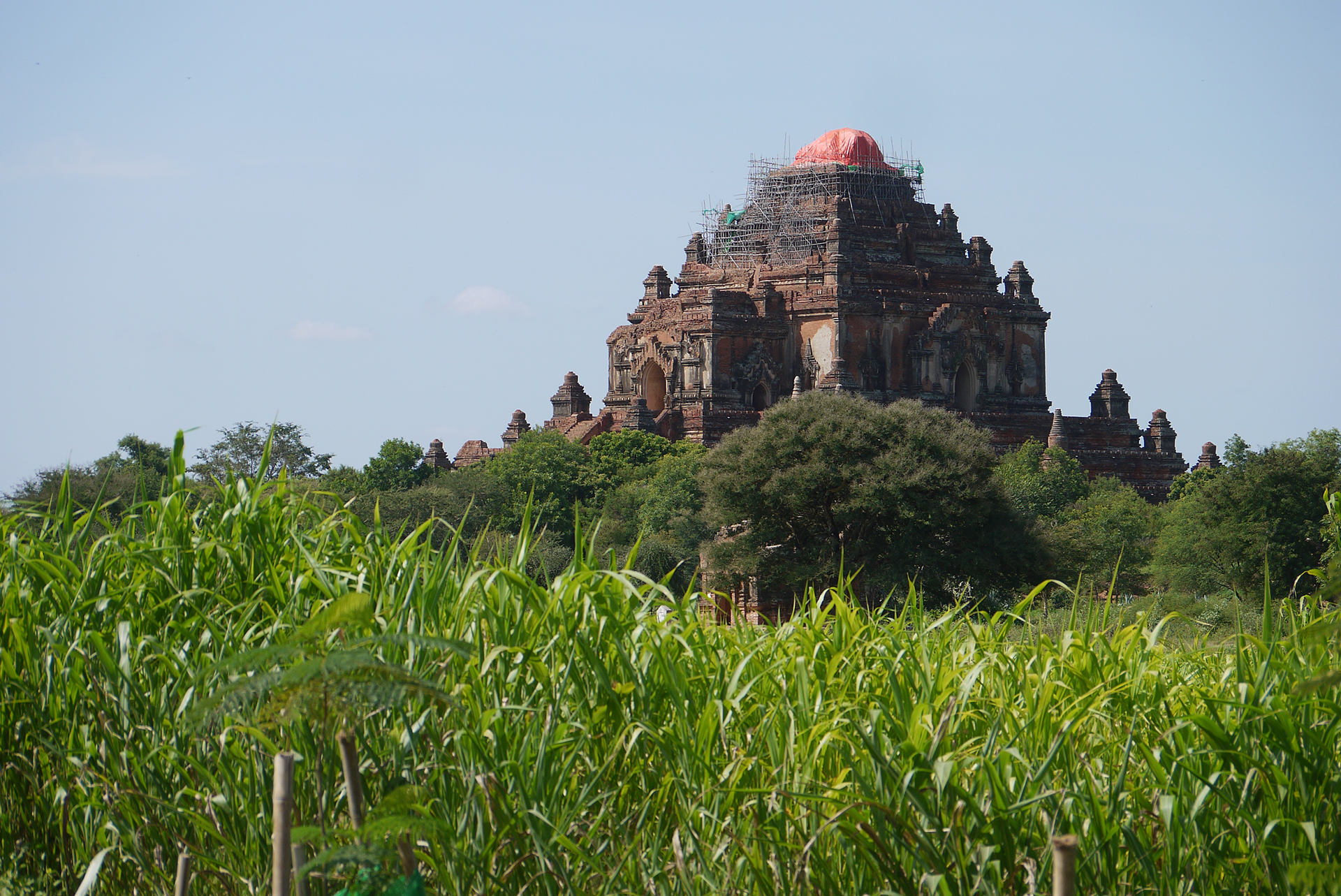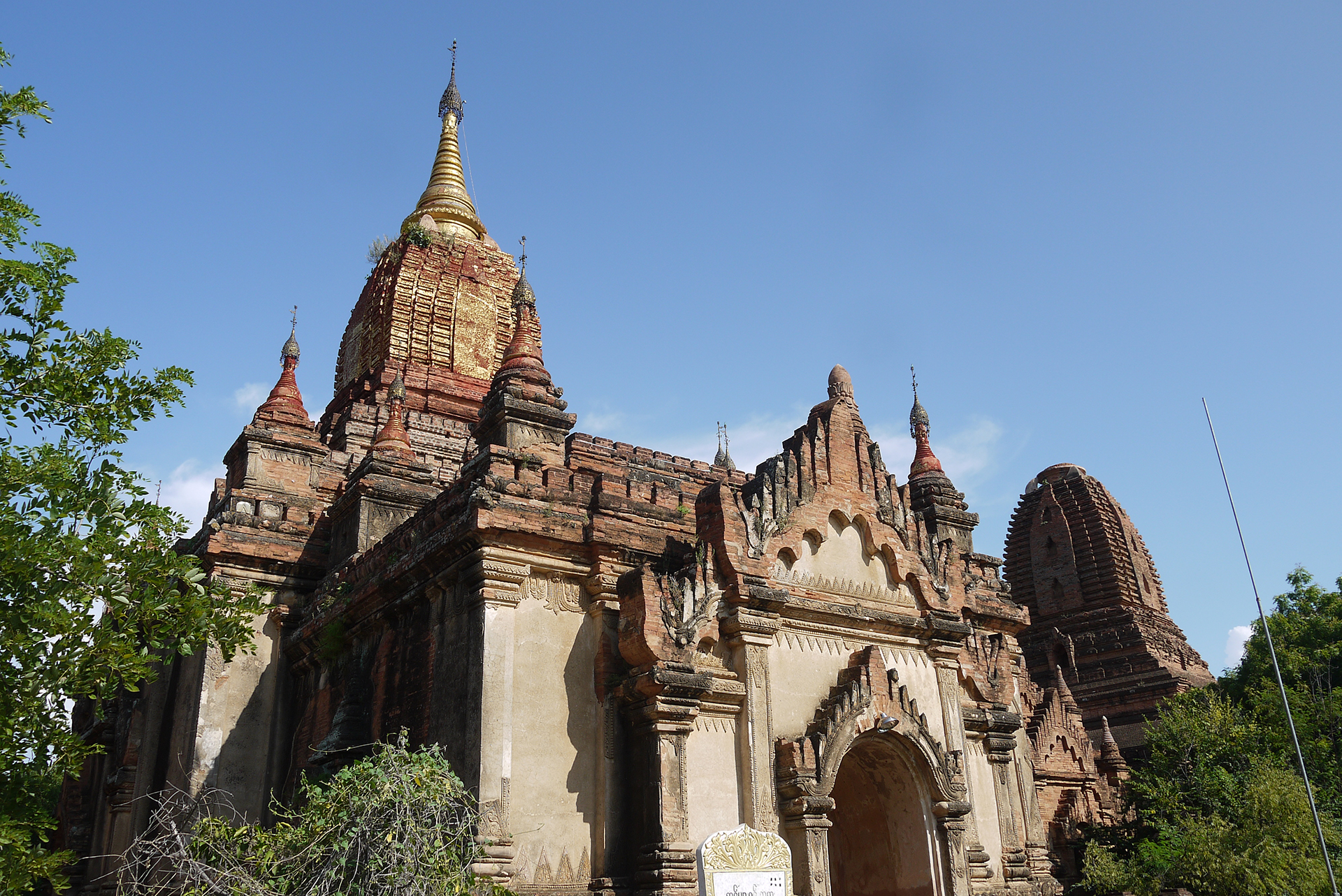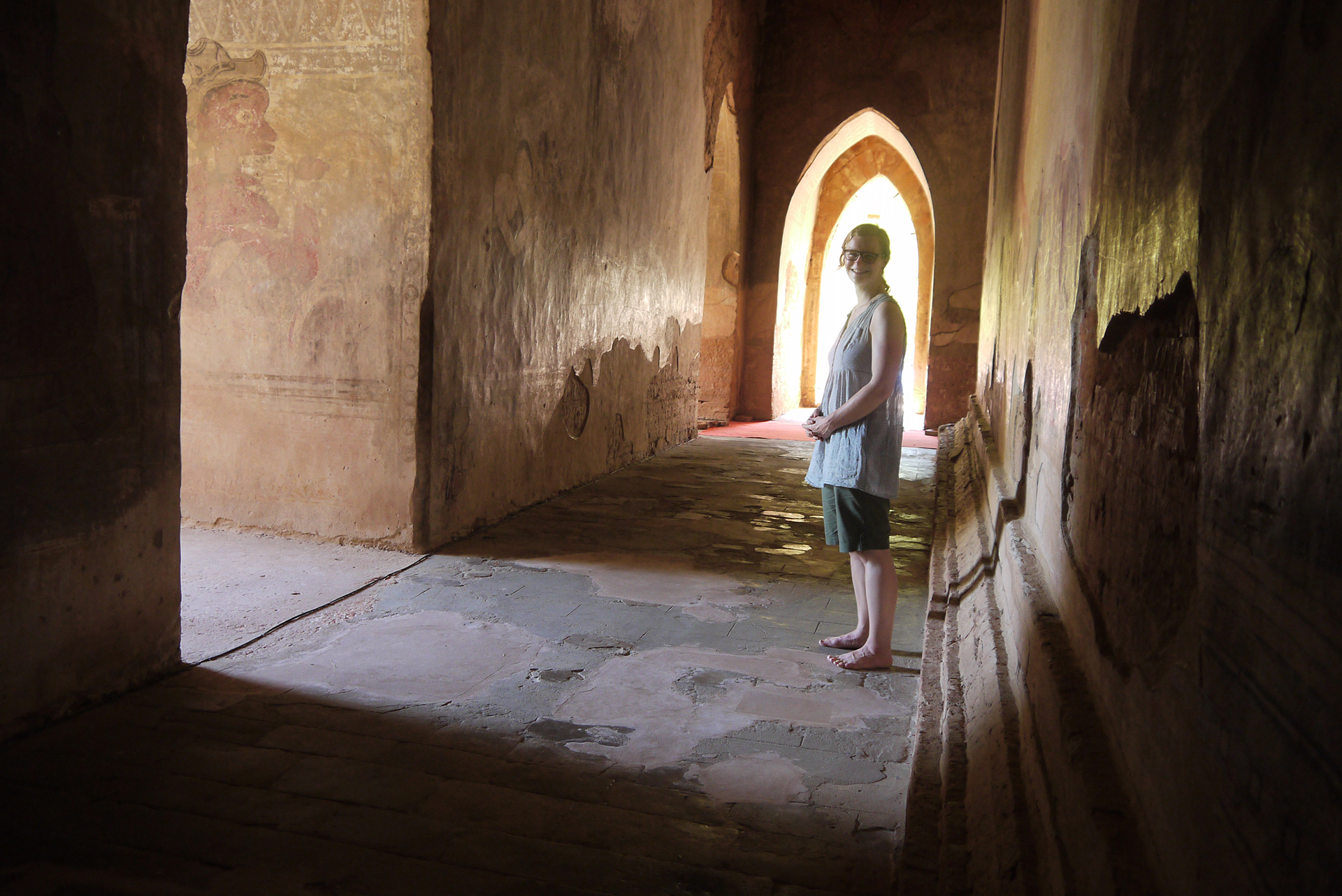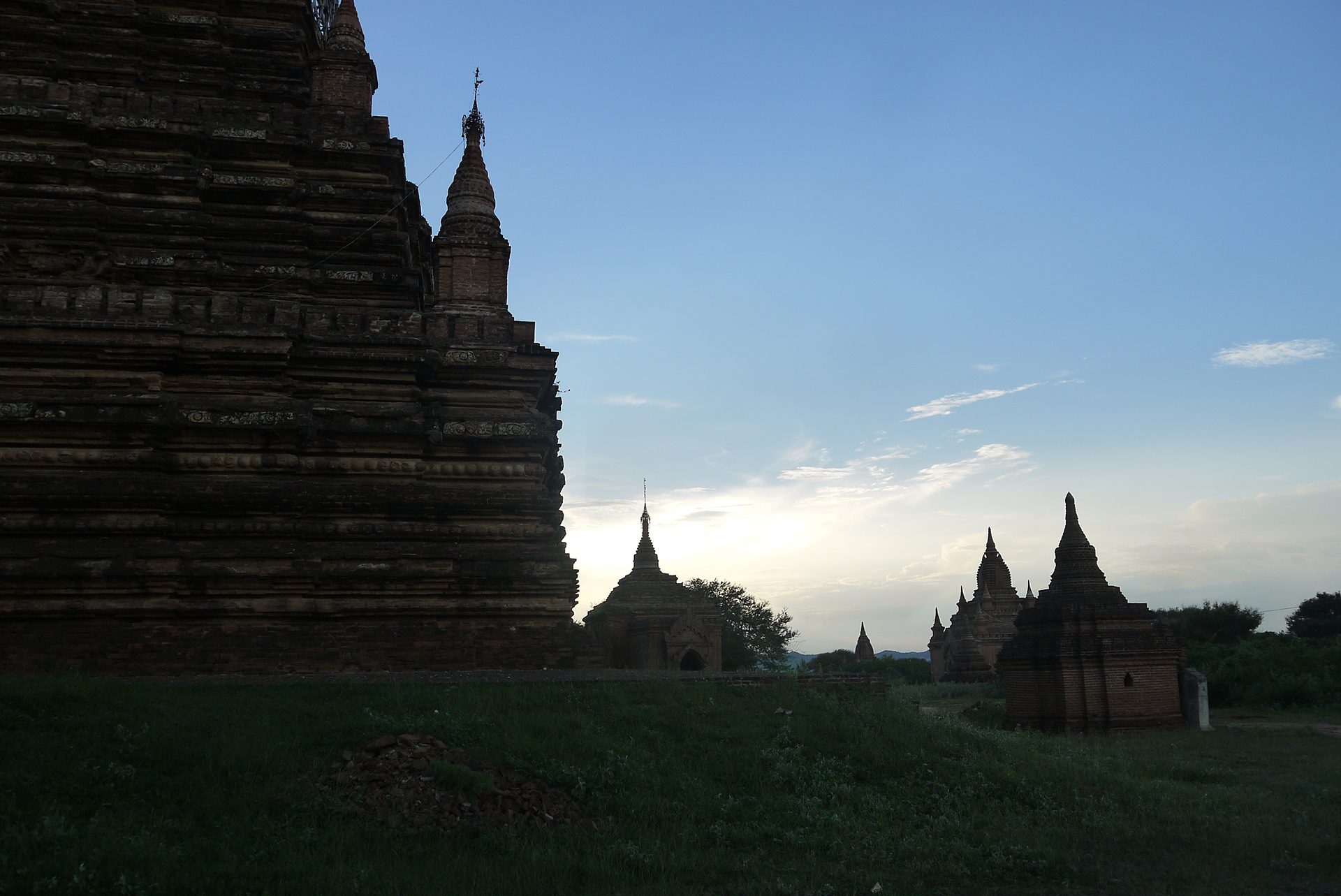 Einigen wird hier schnell langweilig, da sich die Tempel in ihren Hauptmerkmal doch ähneln. Fast alle sind rostrot und aus Backsteinen gebaut. Früher waren sie wohl alle mal mit Stuck übersät und vermutlich angemalt. Heute sind nur noch bei den Wenigsten die Oberflächen erhalten. Doch auch so konnte ich mich kaum sattsehen und war immer wieder fasziniert, wenn eine weitere Ansammlung von Tempeln vor mir auftauchte, die nicht einmal annähernd im Reiseführer aufgeführt werden. So passiert es immer wieder, dass sich plötzlich ein Tempelkomplex vor uns erhebt, der unglaublich groß und gut erhalten ist. Wir finden den Namen kaum im Reiseführer, doch staunen über die detaillierten und extrem weitläufigen Wandmalereien, die einen bestimmt zehn Meter langen liegenden Buddha zeigen. Auch die Buddha-Statuen, die von vielen myanmarischen Besuchern verehrt werden, reichen bis unter die Decke und machen Eindruck.